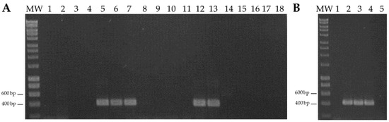 Agarose gel electrophoresis of PCR products of sweet potato symptomless virus 1 using primers Detect-1F/1R. MW, HyperLadder 1kb (Bioline). (A) Lanes 1–18, sweet potato samples CI62–CI79 from the Canary Islands. (B) Samples from a sweet potato germplasm collection. Lanes 1–5, cv. ‘Tanzania,’ ‘Blanca,’ ‘Beauregard,’ ‘Promesa’, and ‘Camote Morado,’ respectively.