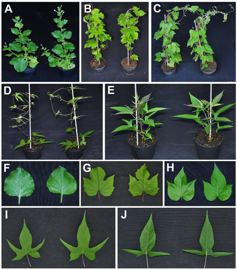 Plant and leaf details of Nicotiana benthamiana (A,F), Ipomoea setosa (B,G), Ipomoea nil (C,H), sweet potato cv. ‘Tanzania’ (D,I) and ‘Camote Morado’ (E,J) infected with the sweet potato symptomless virus 1 infectious clone. In each panel, mock-inoculated plants are shown on the left and infected plants on the right. Photographs of representative plants were taken 40 days post-inoculation.