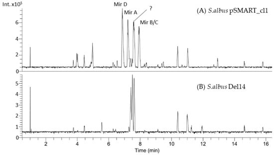 The mutant strain S. albus pSMART_cl1 was pre-cultivated in 100 mL flasks with 10 mL of TSB medium (tryptic soy broth 30 g/L) at 28 °C and 180 rpm on a rotary shaker for 24 h. The main culture, using 50 mL of DNPM medium (dextrin 40 g/L, bacto soytone 7.5 g/L, yeast extract 5 g/L and MOPS 21 g/L, pH 6.8) in a 500 mL flask, was inoculated with 1 mL of preculture and cultivated for 5 days at 28 °C and 180 rpm on a rotary shaker. After cultivation, biomass was separated from the supernatant, and the liquid was extracted with 25 mL butanol. The solvent was removed until dry using a nitrogen sample concentrator while heating at 45 °C. The dried supernatant was taken up in 300 µL of methanol and subjected to high-resolution mass spectrometry (HRMS) analysis. Liquid chromatography (LC) was performed on a Dionex Ultimate 3000 UHPLC system (Thermo Fisher Scientific, Waltham, MA, USA) with a stationary phase Acquity UPLC BEH C18, 100 mm × 2.1 mm, 1.7 µm column (Waters Corporation, Milford, MA, USA), using a linear gradient from 5% [B] (acetonitrile + 0.1% formic acid) against [A] (ddH2O + 0.1% formic acid) to 95% [B] and coupled to a photo diode array (PDA) detector that operated at 200–600 nm. High-resolution mass spectrometry spectra were acquired on a maXIS II™ mass spectrometer (Bruker, Billerica, MA, USA) using positive ionization mode and mass range detection from m/z 200 to 2000. For dereplication, the Dictionary of Natural Products (DNP) (CRC Press, Boca Raton, USA), version 28.1, was used as a database.
