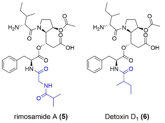 Structures of rimosamide A (5) and detoxin D1 (6) as examples of structural differences from the isolated compounds miramides A–D. The moiety (marked in blue) attached to Phe differs for rimosamides, detoxins and miramides.