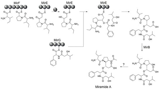 The MirG NRPS protein shows homology to the rimosamide biosynthetic enzyme RmoH (Table 1) and shares with it the following domain organization: C-A-T-TE. The starter condensation domain, which was found in the case of MirG, was reported to be involved in the incorporation of fatty acids. The amino acid specificity of the adenylation domain of MirG cannot be predicted. We propose that MirG catalyzes the condensation of several hydroxylated fatty acids provided by host metabolism with the phenylalanine residue. The formed fatty acid-Phe intermediate is transferred to the thioesterase domain of MirG and subsequently reacts with the MirE-bound precursor to form a depsipeptide bond (Figure 5).