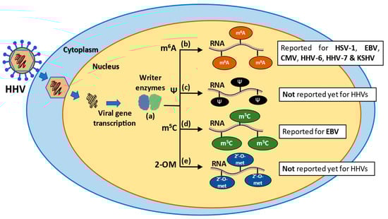 Schematic representation of epigenetic modifications in RNA molecules during human herpesvirus (HHV) infections. (a) After the introduction of the viral DNA into the cytoplasm and posterior transcription of viral genes, writer enzymes perform various epigenetic modifications, such as methyl 6-adenosine (m6A), pseudouridylation (Ψ), methyl-5 cytosine (m5C) and 2′-O-methylation (2-OM). (b) The m6A modification is the most prevalent modification in mRNA and takes place during pre-mRNA synthesis in the nucleus. (c) Pseudouridylation is the most abundant modification in stable RNAs, it is irreversible and occurs through two pathways: an RNA-dependent pathway and RNA-independent pathway. (d) The m5C modification is related to improved function and stability of RNA molecules. (e) The 2-OM modification is found in rRNA and tRNA molecules and is associated with increased stability and translation modulation of mRNAs.