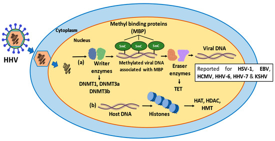 Schematic representation of the epigenetic modifications occurring in viral and host DNA during infection with herpesviruses. (a) Writer enzymes, such as DNMT1, DNMT3a, DNMT3b perform methylations in the viral DNA known as 5’methyl-cytosine (5mC) using SAM as a substrate. The methylation of the DNA is associated with methyl binding proteins (MBP), a type of reader protein, acting as a “scaffold” between 5mC and repressor of complexes such as CoREST. Next, the eraser enzymes (TET) can erase the methylation and form intermediates that are ultimately converted to cytosine such as 5’-hydroxy-methyl-cytosine (5hmC). (b) The histones can also suffer epigenetic modifications by enzymes such as HAT, HDAC and HMT, that favor the latency phase, depending on the modification. Acetylation of lysine 27 in histone 3 (H3K27ac), is associated with active promoters and enhancers. H4K20ac is associated with gene repression. Methylation of lysine 27 in histone 3 is associated with transcriptional repression. H3K4me is related to transcriptional activity of genes.