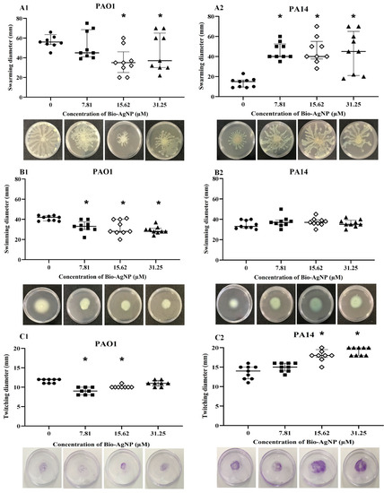 PAO1 twitching motility was significantly inhibited (p < 0.05) by treatment with 7.81 and 15.62 µM bio-AgNPs, leading to reductions of 22.58% and 12.90%, respectively (Figure 2C1). By contrast, in PA14, the twitching motility increased by 34.15% and 39.84% (p < 0.05) after treatment with 15.62 and 31.25 µM bio-AgNPs, respectively (Figure 2C2).