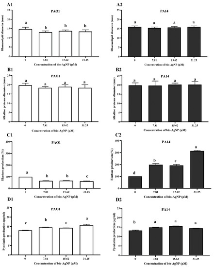 Alkaline protease production was not affected by bio-AgNP treatments (Figure 3B1,B2). The mean halo diameters of PAO1 and PA14 were 19.67 and 19.78 mm, respectively, before treatment, and 18.33–18.89 and 19.67–20.22 mm, respectively, after treatment.