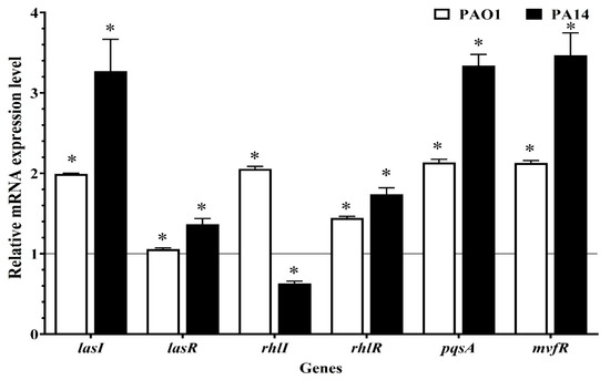Relative expression of quorum-sensing regulatory genes in Pseudomonas aeruginosa treated with bio-AgNPs. The mean relative gene expression was normalized to that of the reference gene proC. * p < 0.05.