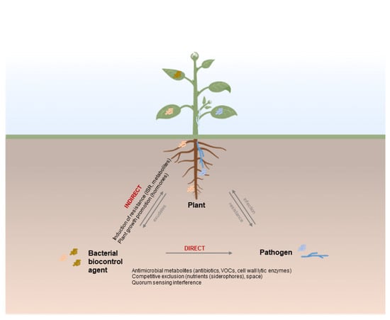 Bacterial biocontrol agents use a great variety of mechanisms to protect plants from pathogen infections. They may use one or a combination of mechanisms to prevent or reduce plant disease, interacting directly or indirectly with the pathogen [10,11] (Figure 1). BCA can interact directly with the pathogen through the secretion of antimicrobial compounds, interfering with the pathogen virulence and competing for nutrients and space. Many BCA synthesize and release metabolites such as lipopeptides, bacteriocins, antibiotics, biosurfactants, cell-wall degrading enzymes or microbial volatile compounds which have antimicrobial activity by reducing growth or metabolic activity of pathogens. BCA may also interfere with the quorum sensing (QS) system of the pathogens, enzymatically degrading or inhibiting the synthesis of signal molecules used to initiate infections. For instance, producing QS inhibitors such as lactonases, pectinases, and chitinases that degrade QS signal molecules impairing pathogen infection and reducing the symptoms of plant diseases [12]. Moreover, BCA can diminish pathogen infection pressure through competitive exclusion over pathogens by reducing their growth without killing them. Highly competitive bacterial BCA may colonize and survive in the infection site and have a more efficient nutrient uptake system than the pathogen, such as low-molecular-weight siderophores with affinity for ferric iron. Besides direct interactions, BCA can protect plants indirectly, by triggering the defense response or promoting plant growth [10,11,13]. They may enhance host defense mechanism eliciting systemic resistance. This results in an accumulation of structural barriers and triggers many biochemical and molecular defense responses in the host, conferring a protective system against a wide range of pathogens. Moreover, BCA can promote plant growth by enhancing mineral and water absorption or producing plant growth stimulating compounds, such as hormones, and thereby improving plant health and fitness. In many cases, various mechanisms are involved in the complex interactions between plants, BCA, and pathogens. Therefore, identifying the mechanisms responsible for biocontrol is a great challenge. Understanding the mode of action responsible for the protective effect of a BCA will facilitate the optimization of biocontrol and allow the establishment of optimal conditions for the interaction between the BCA, the pathogen, and the host, and the design of appropriate formulations and methods of application to enhance plant health and sustainable agriculture.