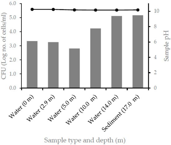 Colony-forming units (bar graph) from enrichment culture in a nitrogen-free media inoculated with samples collected from different depths. The pH of the samples taken from each depth is also shown with the line graph.