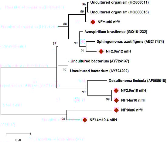 The nifH gene fragment was amplified from 11 of the 19 isolates tested. Phylogenetic analysis based on nifH gene fragment sequences showed that their closest matches were diazotrophic bacterial strains belonging to the phylum, Proteobacteria, and uncultured microorganisms isolated from different environments. For example, the nifH gene fragment sequenced from clone, Mud6, showed greater than 96% similarity to the nifH gene sequence of an uncultured organism clone obtained from the Mediterranean Sea []. The nifH gene fragments of NF10m6, NF2.9m8, and NF14m10 showed 100%, with a putative nitrogenase reductase gene obtained from the uncultured microorganism clone, B10-31, obtained from a marine habitat [], whereas the nifH gene fragment of isolate, 14m10, showed more than 92% sequence identity with the B21 dinitrogenase reductase (nifH) gene of uncultured bacterium clone, DUN1_nifH_+, and uncultured bacterium clone, DUNnif131 (+B26) [].