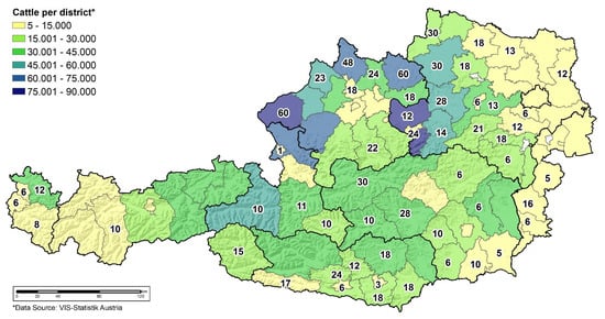 Slightly less than two million cattle are kept in Austria, around 50% each in Upper and Lower Austria. Around 75,000 horses have been reported in the VIS database for 2018; approx. 40% are kept in Upper and Lower Austria. The geographical distribution of cattle and horses in Austria is unequally distributed (Figure 7).