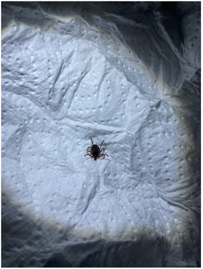 So far, eight ticks (Figure 2) were reported via photographic images (Figure 3) and were explicitly identified as Hyalomma sp. Out of these, three could be further processed, whereas the others were disposed prior to exact species determination and pathogen analysis (Table 1).