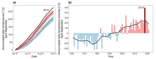 (a) Temporal evolution of accumulated daily temperatures (averaged over the Austrian domain) from April 1st to September 30th for each year from 1961 to 2021; the year 2018 is highlighted in darker red. (b) Accumulated daily temperature anomalies from April 1st to September 30th from 1961 to 2021 relative to the 1961 to 2020 mean; the year 2018 is highlighted in darker red.