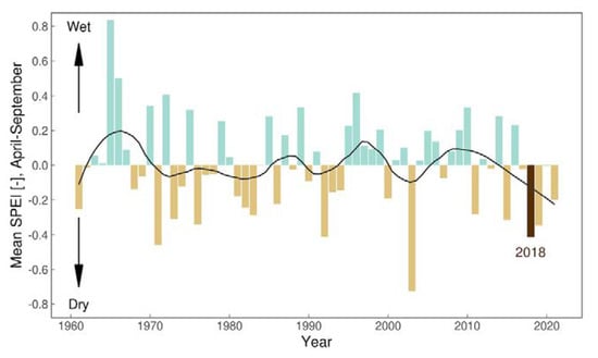 Starting from 1961 and in the observed timeframe from April to September, 2018 displayed an extraordinary event if looking at accumulated daily temperatures (Figure 4). Concerning the dryness (SPEI—Standardized Precipitation Evapotranspiration Index), April until September 2018 is recognized as dryer than normal (Figure 5).