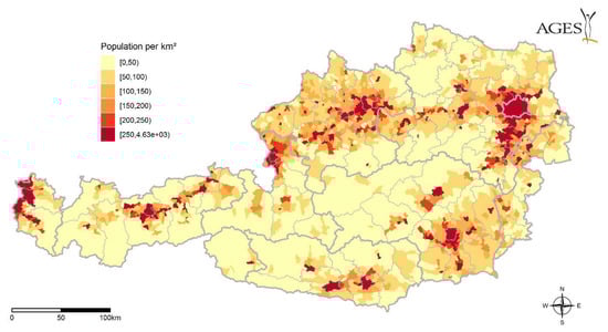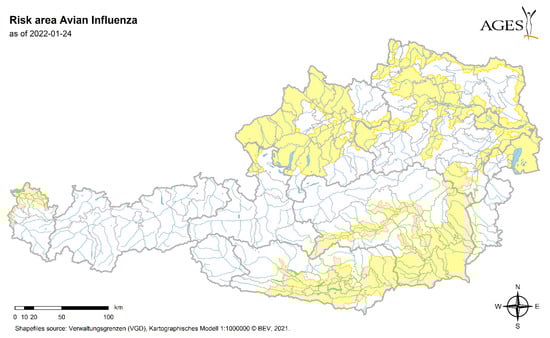 A map of Austria’s avian influenza (AI) risk areas is used as an approximation for the most likely occurrence of migratory birds []. The risk areas on this map were defined based on various parameters. Primarily, communities along large bodies of water and with positive AI findings in the past were selected; additional areas were evaluated based on expert knowledge.