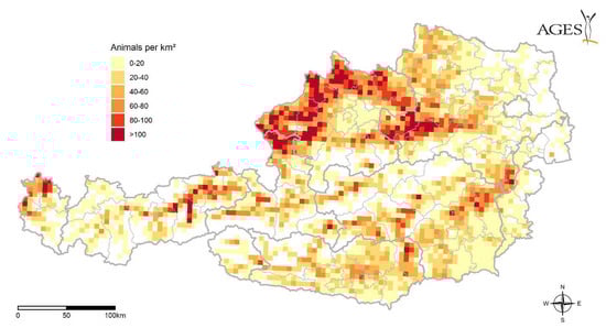 Livestock information for cattle and horses was obtained from the Austrian animal husbandry database (Verbrauchergesundheitsinformationssystem, VIS), which covers the year 2018. The database includes the geographical location of each farm. This information was used to aggregate the number of animals into 5 km grids (regional statistical grids—data.statistik.gv.at—under consideration of data protection). Horses are covered by the database only in the case of a reporting obligation because of other livestock animals (cattle, pigs, small ruminants); this leads to an underestimation of the horse population (compare Pferd Austria, IWI, 2019).