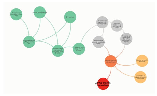 Based on the conceptual definition of risk in the context of climate change, we followed the approach of climate impact chains to identify causal drivers of risks for an infective bite by Hyalomma sp. and a pathogen. Climate impact chains are an analytical concept to better understand, systemize and prioritize the climate, environmental and socio-economic drivers of related hazards, vulnerabilities, exposures and risks in a specific system [].