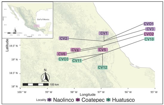 Sampling sites in Veracruz, Mexico. Managed coffee agroecosystems plots (CV) and non-managed plots (CVO) were sampled at three localities: Naolinco (CV1–3 and CVO1), Coatepec (CV4–6 and CVO2), and Huatusco (CV10–12 and CO3) in Veracruz, Mexico.