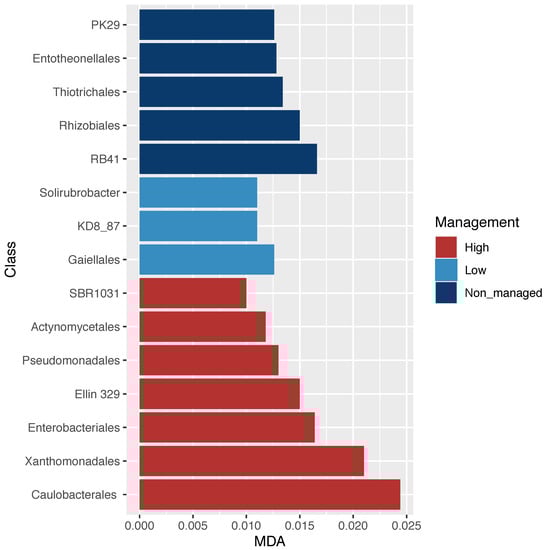 The analyses of microbial community diversity (alpha diversity, Chao1 index) did not show differences across samples for localities or management categories (Figure S1). In contrast, when community composition (beta diversity) was analyzed, through non-metric multidimensional scaling, differences across samples based on management categories but not on localities were observed (Figure 2). Moreover, ordination based on community composition differences was related with differences in C:N and pH between managed and non-managed categories (Figure 2). The relative abundance of microbial orders (Figure S2) was used to identify specific bacterial orders statistically associated with management categories. Through RF analysis, specific bacterial orders were identified with three management categories (non-managed, low-management, and high-management), as shown in Figure 3.
