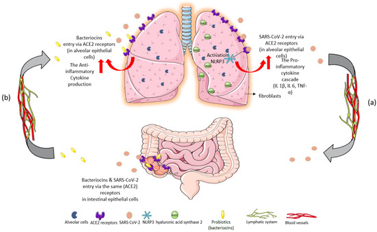 The gastrointestinal tract is colonized by a wide range of dynamic microbial populations, consisting mainly of anaerobic bacteria, known as gut microbiota. Direct microbial–host interaction affects many physiological functions such as digestion, metabolism, intestinal barrier integrity (epithelial barrier), organ function, and immune homeostasis [1]. Bacteria usually live in a symbiotic relationship with the host, while perturbations in their composition and function cause dysbiosis associated with gastrointestinal, neurological, metabolic, cardiovascular, and respiratory disorders [2]. Lungs, for years, have been considered to be sterile because microbiological culture techniques have shown negative results. Nowadays, technological advances confirm that healthy lungs host a dynamic and diverse bacterial ecosystem [3]. The predominant genera that colonize healthy lungs are Bacteroidetes and Firmicutes, followed by Proteobacteria and Actinobacteria [4]. Dysbiosis can weaken nonspecific lung immunity, promote the host’s susceptibility to infections, and may worsen chronic lung disease. In addition, changes in lung flora affect cytokine production by triggering the transition from anti-inflammatory to proinflammatory cytokines, thus promoting injury to the pulmonary epithelium resulting in fibrosis [4]. The interaction between lung and gut microbiota involves a bidirectional communication with metabolites and toxins produced by intestinal bacteria arriving at the lungs through the circulation and lymphatic system, known as the “gut-lung axis” [5]. Microbiota-immune interactions regulate the inflammatory response by activating this axis through bacterial populations and their by-products which leak the mucosal barrier (translocation) [2]. The bacterial translocation, leukocyte transport, and inflammatory cytokine secretion through the gut–lung axis are phenomena also found in SARS-CoV-2 infection, worsening the clinical outcome of patients [6]. Although COVID-19 is primarily a viral respiratory disease caused by SARS-CoV-2, more and more evidence suggests that the gastrointestinal tract is involved in COVID-19 [7]. SARS-CoV-2 infects intestinal epithelial cells (IECs) too, due to its transport through the lymphatic system, resulting in disruption of intestinal permeability and mucosal integrity [8]. Thus, there appears to be a vital cross-communication between the microbial communities in the mucous membranes of the lungs and the intestine [4]. Probiotics have well-documented antiviral activities against common respiratory viruses such as respiratory syncytial virus, influenza, and rhinovirus. Probiotics regulate cytokine secretion, thus affecting both nonspecific and specific immune response. Bacteriocins, produced by lactic acid bacteria (LAB), are proteinaceous substances with antimicrobial properties that can inhibit the adhesion and invasion of other agents in the intestinal epithelium [9], as shown in Figure 1.