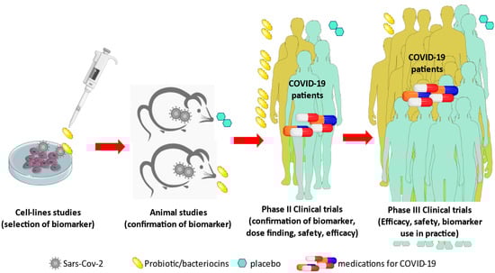 These biomarkers should be confirmed by experimental studies using an animal model, and thereafter the schedule continues with dose-finding phase II clinical trials. Finally, efficacy and safety of the intervention, as well as biomarkers used in clinical practice must be confirmed in phase III clinical trials to establish probiotics as cotreatment against SARS-CoV-2 infection.