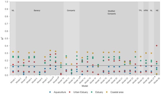Robust ANOVA based on trimmed means [,] was used to test the difference in model performance (obtained ) between different habitat types (aquaculture, urban estuary, estuary, and coastal area). Robust ANOVA was used to overcome the problems associated with deviations from homoscedasticity/normality and to reduce the influence of outliers observed in the data. Post hoc tests were also performed in the robust WRS2 environment [], where p-values were adjusted for multiple testing using the Benjamini–Hochberg (BH) method.