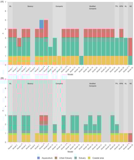 Model generality. Stacked bar chart used for graphical representation of model’s applicability on the dataset from a specific habitat: colors represent habitats (see the legend), and stars (*) denote models that exhibit the evaluation issue with some of the data points in some of the datasets (details in Appendix D). Values on y axis denote the frequency of occurrence of a particular model whose R2 value is above the median (; Panel A), and in the first quartile (; Panel B). Primary models are labeled as follows: ML—modified logistic, Baranyi, Gompertz, modified Gompertz, TPL—three-phase linear, HPM—Huang primary, NL—no-lag and NE—net exponential. Star (*) signifies models that had an evaluation issue with some of the data points in some of the datasets (details in Appendix D). Note that there is only one coastal area dataset, while other habitats have two datasets each. Hence, scoring a single occurrence of the coastal area habitat represents a 100% success rate, while scoring the same in any other habitat represents a success rate of 50%.