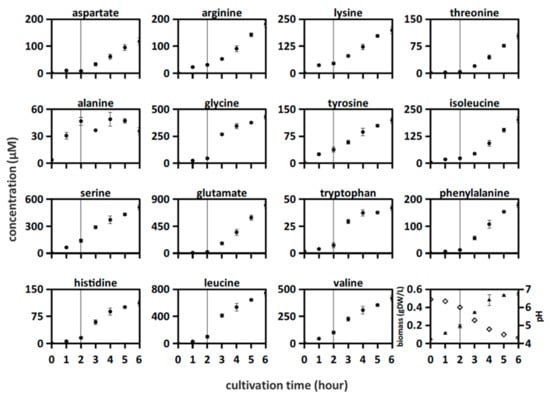 Amino acid concentrations were measured in Lactobacillus bulgaricus LB.1 culture in synthetic medium supplemented with casein (SMcas). The line indicates a change in increasing amino acid concentration profiles after 2 h. Downright: biomass (triangle) and pH (rhomb) measurements.
