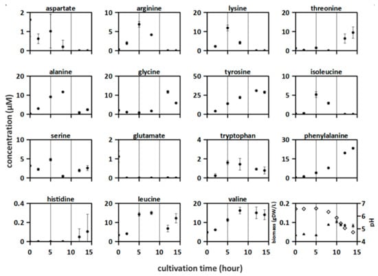 The dynamics of amino acid release and uptake in the proteinase-positive S. thermophilus ST.1, amino acid concentrations were measured over a culturing period of 14 h (Figure 2). The following three distinct phases were identified: 0–5 h, increase of some amino acid concentrations but no change in biomass and pH; 5–10 h, acidification, biomass increase, and decrease of some amino acid concentrations while others kept increasing; 10–15 h, acidification, biomass decrease, and uptake and release of amino acids. The concentration of all analyzed amino acids increased at some time point. Additionally, the pH decreased from 6.6 to 4.7, whereas the biomass increased from 0.03 gDW L−1 to 0.1 gDW L−1 (Figure 2). Furthermore, 12 out of the 15 amino acids were consumed at some points in time. Moreover, the concentrations of some amino acids exhibited an oscillating release-consumption-release profile (e.g., serine and leucine). After 12 h, almost all lactose was consumed (30 mM), which was accompanied by the production of large amounts of glucose (22 mM) and lactate (30 mM) (Figure S3).