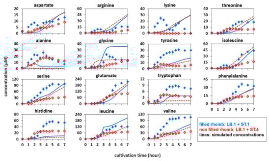 By way of analogy, Figure 3 shows the difference between the measured amino acid concentrations in the S. thermophilus ST.4—L. bulgaricus co-culture and the simulated amino acid concentrations released from L. bulgaricus. Here, most of the measured amino acid profiles, except for alanine, tryptophan, and histidine, were lower than those of the simulated courses. This indicates increased uptake of amino acids, likely via the proteinase-negative S. thermophilus ST.4, which can only feed on amino acids and peptides released from L. bulgaricus but not from casein.