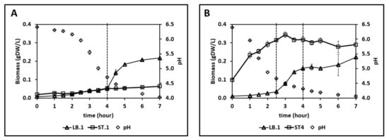 Strain-specific biomass profiles measured by flow cytometry and pH measurements in (A) LB.1–ST.1 (initial biomass fraction of 1:2 (LB:ST)) and (B) LB.1–ST.4 (initial biomass fraction 1:10 (LB:ST)) co-cultures in synthetic medium supplemented with casein (SMcas).