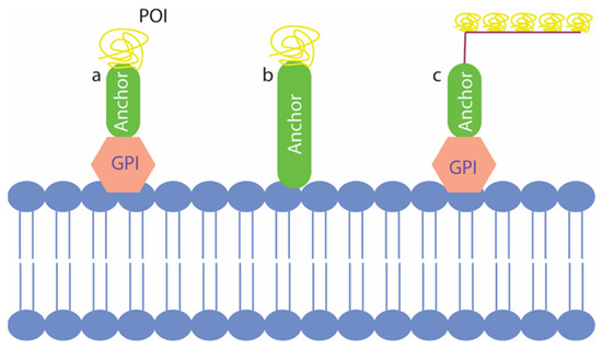 Three types of yeast surface displays that have been used in the past. (a) represents the classical yeast surface display with glycosylphosphatidylinositol (GPI) dependent anchor fused with the protein of interest (POI); (b) shows GPI independent anchor fusion with POI displayed in the cell surface; (c) shows co-display of multiple POIs on the cell surface using the GPI dependent strategy.