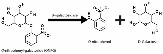 The reporter constructs in the early phases of biosensor discovery utilized biochemical reporter genes. The lacZ gene from Escherichia coli which encodes the enzyme β-galactosidase, has been extensively used in all types of biosensor designs [50]. The β-galactosidase enzyme catalyzes a reaction that converts a colorimetric substrate o-nitrophenyl-galactoside to o-nitrophenol and galactose. The o-nitrophenol thus produced can be readily measured by light absorbance at 420 nm wavelength (Figure 3) [51]. The reporter is constructed in a way that the β-galactosidase expression is controlled by the promoter of interest becoming activated/induced upon receiving the stimulus of interest. If the assay is developed within the yeast two-hybrid system, the promoter activation requires the interaction of the two hybrid fusion proteins of Gal4p fragments [18]. Meanwhile, if the assay is directed to detect the expression of a heat shock promoter, a heat shock promoter will control the expression of the lacZ gene [52].