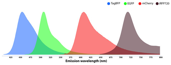 So great is the number of fluorescent proteins that a database has been developed, providing a detailed list of fluorescent proteins that have been used in various studies as well as those that are not yet applied in yeast studies [62]. The beauty in their application is that the sequences encoding these fluorescent proteins can be fused to genes encoding proteins of interest to determine where those proteins of interest are located and how they are expressed inside a cell. In addition, sequences encoding fluorescent proteins can be placed downstream of promoters of interest so that one can gather information on the expression of those promoters in live cells [55]. To interrogate the yeast about more events at the same time, one needs to introduce more designs to overcome the challenges of co-expression of many fluorescent fusion proteins and/or fluorescent markers. The emission ranges of the different fluorescent proteins used in the reporter system should preferably not overlap substantially. Ideally, if possible, no overlap in the emission range of the two or more proteins should be considered. Hence, the selection of the fluorescent proteins must be made with caution, considering the final goal of the research (Figure 4). If there is a significant overlap in emission spectra, one needs to apply complex algorithms to compensate [63].