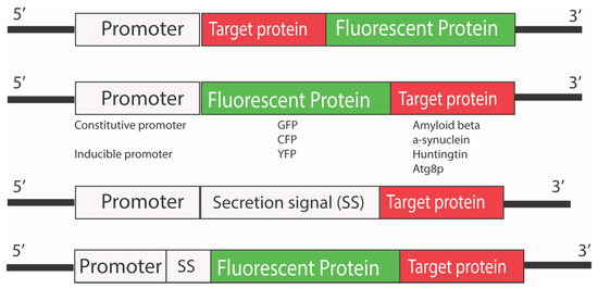 The expression of fluorescent protein tagged with disease-associated proteins is nowadays a common strategy for designing biosensors for studying diseases [64]. Proteins such as huntingtin, alpha-synuclein, and Aβ that are involved in Huntington’s disease, Parkinson’s disease, and Alzheimer’s disease, respectively, have been tagged with fluorescent proteins to study their role and to screen drugs [65]. Most commonly, green fluorescent proteins have been used as fluorescent markers, mostly due to the availability of several analytical platforms to detect the protein; however, other proteins, such as cyan fluorescent protein (CFP) and yellow fluorescent protein (YFP), have also been used to tag the proteins of interest (Figure 5).