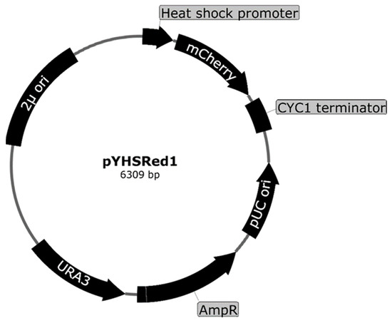 Genome-wide expression analyses in yeast producing the fusion protein showed that Aβ produced a stress response, which in yeast is referred to as the heat shock stress response (HSR) [71]. Heat can induce this response, but so can other factors, such as protein misfolding and reactive oxygen species (ROS) [72]. The heat shock response to Aβ was initially observed in genome-wide expression analyses and confirmed by introducing an HSR reporter plasmid into yeast to report on lacZ expression [52]. The HSR reporter yeast is a typical transcription factor (TF)-based biosensor as the biosensor design involves the expression of a reporter gene under the control of a heat shock promoter. The heat shock promoter in the biosensor contained heat shock elements (HSEs), which are recognized by the transcription factor heat shock factor 1 (HSF1) [73]. The compounds/ligands/biomolecules that can activate cytoplasmic HSF1 and aid its nuclear translocation will result in the expression of the reporter gene. Most recently, the HSR to Aβ was demonstrated in living yeast cells with a reporter plasmid expressing the fluorescent protein mCherry under the control of the HSR promoter when exposed to Aβ [55]. In the plasmid, the expression of the reporter gene encoding mCherry red fluorescent protein is controlled by the heat shock promoter (Figure 6). The mCherry fluorescent protein was incorporated into the design based on the protein’s ability to fluoresce in a wide range of pH, meaning that its fluorescence is not quenched in low pH organelles such as vacuoles/lysosomes [74]; however, similar fluorescent proteins can also be used in place of the mCherry fluorescent protein, and is subject to the future applications. In the assay, the activation of heat shock promoter by Aβ increased expression of the mCherry was analyzed using fluorescence microscopy and flow cytometry.