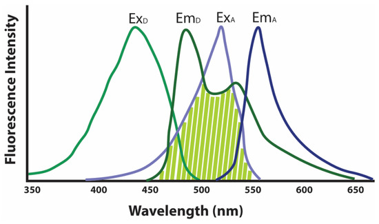 Excitation–Emission of the FRET donor (green curves) and FRET acceptor (blue curves) showing substantial overlap (shaded light green) in the range between FRET donor emission and FRET acceptor excitation. ExD, FRET donor excitation range; EmD, FRET donor emission range; ExA, FRET acceptor excitation range; and EmA, FRET acceptor emission range.
