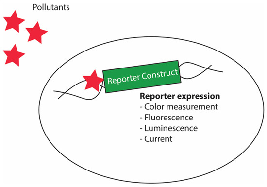 The scheme of most biosensor designs is somewhat similar as they contain stimuli sensing elements and stimuli response elements. In the biosensor design, the stimuli sensing elements are the part such as promoters containing pollutant response elements, and the stimuli response elements refer to the reporter gene whose expression can be evaluated (Figure 8); however, some designs may be drastically different, but the overall underlying principle is similar. The pioneering application of yeast in environmental science involved its use in the measurement of biological oxygen demand (BOD) in wastewater [110,111]. BOD measurement in wastewater is a method to determine the levels of biodegradable organics in it. The standard method to detect the BOD takes around 5 days to give reliable measurement; yeast-based biosensors, in contrast, provide analogous reliable evaluation of BOD in minutes [44]. The basic principle of BOD measurement involves the measurement of the oxygen utilized during aerobic oxidation within a specified period [112]. Because yeasts can oxidize a broader range of organic compounds and considering their ability to withstand several toxic compounds, yeast biosensors are used to measure BOD. Hence, these sensors possess advantages over other microbial systems in measuring BOD in wastewater. The yeast biosensors allow the effective transfer of electrons to the electrode in the presence of mediator(s) such as ferricyanide [111]. This property of the yeast cells has been utilized to develop the yeast-based BOD sensors coupling with such mediators. The outputs of the biosensors are measured either by using oxidation reactions leading to chemiluminescence or by amperometry measurement [113]. Another similar application of yeasts was their use in biosensing the estrogenic activity of pollutants [112]. The estrogenic activity sensor was designed using a plasmid vector consisting of the reporter gene lacZ, which is expressed under the control of an inducible promoter with estrogen response elements and integrates the human estrogen receptor gene into the yeast genome. Once the pollutants encounter the yeast biosensor, the estrogenic activity of the pollutants activates the estrogen response elements, then activates the expression of a reporter gene.