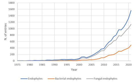 A bibliographic search with the keyword “Endophyte” on the PubMed database from 1946 to 2022 sorted out a total of 12,372 entries, while 9547 and 3410 entries are sorted for more specific “Fungal Endophytes” and “Bacterial Endophyte”, respectively (16 August 2022). While for “Endophytes” (manly fungi) already in 1946 two papers are indexed, the first paper indexed with “Bacterial Endophytes” dates to 1975. Indeed, only later it was recognized that many bacterial taxa colonize the internal tissues of plants, without harming them. In the last 15 years, an increasing trend of research papers is witnessing the interest of the scientific community toward microbial endophytes (Figure 1), mainly for fungal endophytes, though interest in bacterial endophytes is increasing.