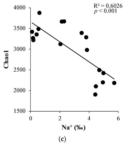 Linear regression between bacterial species richness and soil physiochemical properties. (a) Relationship between bacterial species richness (Chao1) with soil pH. (b) Relationship between bacterial species richness with soil EC. (c) Relationship between bacterial species richness with Na+ concentration in soil.