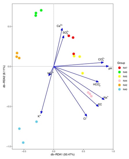 The soil physiochemical characteristics varied widely across the samples and are summarized in Table S2. Soil pH ranged from 8.13 to 10.45, which was lowest at N40 and highest at N45. The EC was highly varied across the soil samples, and soil EC was highest in the N44 soil samples (averaging 352 mS/cm) and lowest in the N42 soil samples (averaging 8.9 mS/cm). The N47 soils had the highest concentration of total Ca2+, while the N40 soils contained the most Mg2+ and K+. Na+ was the primary cation across all soil samples, with concentration ranging from 0.2‰ to 5.1‰ (w/w), while HCO3- (ranging from 0.9‰ to 7.5‰) and SO42− (ranging from 2.3‰ to 7.3‰) were the most represented anions. The soil samples at N44 and N45 had significantly higher concentration of HCO3− than other soil samples (p < 0.05; t-test), and the pH in N44 and N45 soils was significantly higher than other soils. N44 soil samples had the highest EC (352 mS/cm), followed by N45 (346 mS/cm), N40 (174 mS/cm), N47 (84 mS/cm), N46 (17 mS/cm), and N42 (9 mS/cm) soils. The high soil pH in the saline–sodic soils was primarily caused by a high concentration of HCO3-. Spearman’s correlation analysis showed that both soil pH and EC were significantly correlated with the content of HCO3- and Na+ in soil (Spearman’s correlation analysis, p < 0.05; Figure S1). The concentration of Na+ was positively correlated with the content of CO32− (p < 0.01).
