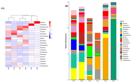 Significant dissimilarities between the bacterial communities in different samples were shown in genus-level community composition. The dendrogram showing the cluster dissimilarity between samples revealed three clusters: N40 clustering with N42, N44 clustering with N45, and N46 clustering with N47 (Figure 6A). Both N44 and N45 soils had high relative abundance (>0.5%) of Nitrolancea (class: Thermomicrobia), Bacillus (class: Bacilli), Truepera (class: Deinococci), Egicoccus (class: Nitriliruptoria), and Halomonas (class: Gamma-Proteobacteria). Abundant Sphingomonas (class: Alpha-Proteobacteria), Pontibacter (class: Flavobacteriia), Gemmatimonas (class: Gemmatimonadetes), and Flavisolibacter (class: Chitinophagia) were detected in both N46 and N47 soils. The bacterial community in N40 soils was dominated by Woeseia (under the class of Gamma-Proteobacteria), while Thiobacillus (class: Beta-Proteobacteria) was the dominant bacterial genus in N42 soil bacterial community (Figure 6B). The relative abundance of Woeseia in N40 soils was up to 11.7%, and Ilumatobacter (1.3%; class: Acidimicrobiia), Nitrospira (1.1%; class: Nitrospira), and Haliangium (0.8%; class: Delta-Proteobacteria) were also abundant in N40 soils. Thiobacillus was the most abundant bacterial genus in N42 soils, with a relative abundance of 8.1%, followed by Lysobacter (1.4%; class: Gamma-Proteobacteria), Azoarcus (1%; class: Beta-Proteobacteria), Sphingomonas (0.8%), and Nitrospira (0.7%). The bacterial communities in N44, N45, N46, and N47 had relatively even abundance of the major bacterial genera within each soil sample, with the relative abundances of the most abundant bacterial genera below 4%. The most abundant bacterial genus in N44, N45, N46, and N47 was Nitrolancea (relative abundance in N44: 2.6%), Bacillus (relative abundance in N45: 2.1%), Sphingomonas (relative abundance in N46: 23.3%), and Pontibacter (relative abundance in N47: 2.7%), respectively.