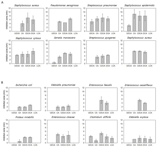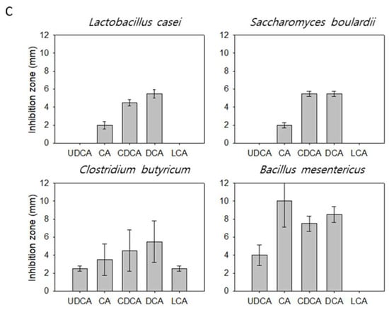 The most hydrophilic and hydrophobic bile acids are shown in the left and right bars of Figure 1A–C, respectively. The susceptibility of microorganisms to the bile acids was determined based on the inhibition zone diameter in the disc diffusion test.