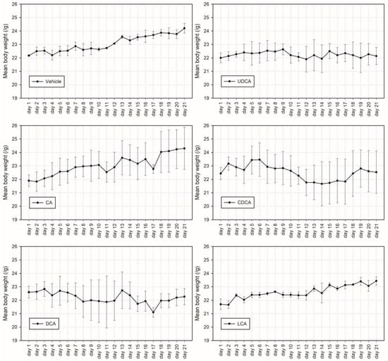 The body weights (Figure 2) of mice in the DCA, CDCA, and UDCA treatment groups were non-significantly lower than those in the vehicle, CA, and LCA treatment groups.