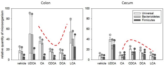 Microbiotas in the colon and cecum. The graph on the left represents the gut microbiota obtained from the colon when the mice were sacrificed, and the graph on the right represents the gut microbiota from the cecum. The horizontal axis indicates the group treated with each bile acid, and the vertical axis indicates the relative quantity of microorganisms. White bars represent quantification results using the universal bacterial primer for the genome sequence common to all bacteria, gray represents Bacteriodetes, and black represents Firmicutes. The same letters in the small shaded circle indicate a non-significant difference between groups, and significant differences were indicated with different letters. Each phylum was shaded the same as in the graph bars. Changes in microbial counts with bile acid administration were observed inversely in the colon and cecum except in the UDCA treatment group. (See the curve above the bar).