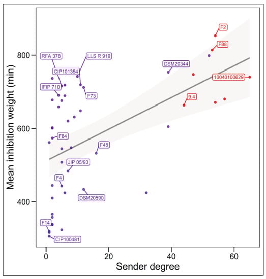 The analysis of the relationship between the mean intensity of inhibition of C. maltaromaticum receiver strains and the sender degree (the number of strains inhibited by a given strain, i.e., the width of the inhibitory spectrum) revealed that the intraspecific inhibition spectra are related to the inhibition potency. Indeed, the broader the spectrum of inhibition of C. maltaromaticum strains, the higher the potency of inhibition (p-value < 8.8 × 10−5) (Figure 2). In addition, the strains that were able to strongly inhibit L. monocytogenes EGDe, including the strains F2, F88, 10040100629, and 9.4, show a wide spectrum of inhibition of conspecific strains. However, the linear model only explains approximately 29% of the variability (R2 = 0.29). This is due to strains with low sender degrees and high inhibition potency, namely strains RFA 378, LLS R 919, IFIP 710, CIP 101354, and F73 (Figure 2). This indicates that strains with narrow intraspecific inhibitory spectra can also exhibit potent antimicrobial properties.