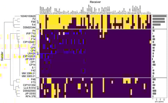 Although the potency of inhibition tended to increase when the sender degree increased, several strains were characterized by high potency of inhibition and narrow anti-C. maltaromaticum spectrum. This suggests that the antimicrobial compounds involved in these inhibitions exhibit high molecular specificity and target receptors characterized by inter-strain variability. Little is known about the bacteriocins involved in conspecific inhibitions in LAB since the majority of studies are conducted with the perspective of engineering biopreservation systems targeting unwanted microorganisms. However, it is known that bacteriocins produced by LAB can specifically target bacteria that are closely related to the producers. For instance, the bacteriocin mesenterocin 52B is produced by Leuconostoc mesenteroides subsp. mesenteroides FR52 only inhibits bacteria from the genus Leuconostoc [65].
