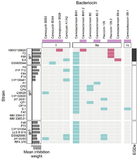 Clustering analysis was performed on the basis of intraspecific inhibition spectra of the 29 strains that were subsequently selected for genome mining. The strains were clustered into three groups: gp1, gp2, and gp3 encompassing 5, 17, and 7 strains, respectively (Figure 3). The strains from gp2 and gp3 have a narrow inhibitory spectrum of C. maltaromaticum strains and weakly inhibit L. monocytogenes EGDe. Conversely, the strains that belong to gp1 have a wide spectrum of inhibition of C. maltaromaticum as well as a high potency of inhibition of L. monocytogenes EGDe (p-values < 0.001, Figure 4). However, not all strains of gp1 are characterized by high anti-L. monocytogenes EGDe potency since among the five strains, the strain DSM20344 is a weak inhibitor of the pathogen (Figure 3).
