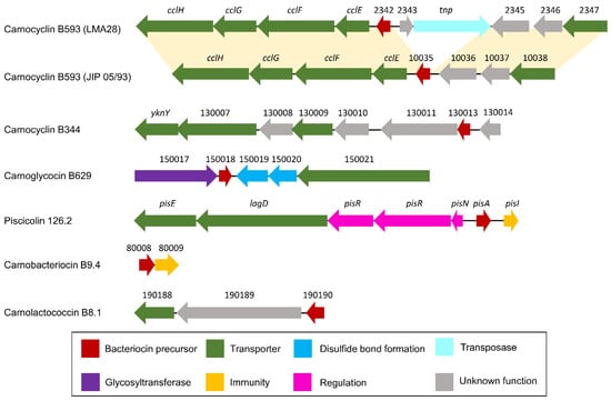 More precisely and according to the classification proposed by Alvares-Siero et al. [4], five structural genes would encode four class I bacteriocins: two head-to-tail cyclic peptides (carnocyclin B593 and carnocyclin B344), one glycocin (carnoglycocin B629) and one two-component lantibiotic (carnolysin A1-A2, encoded by two Coding DNA Sequences, CDSs). Eight clusters were associated with class II bacteriocins, among which seven structural genes of class IIa (carnobacteriocin BM1 and BM1.2, carnobacteriocin B2 and B2.2, piscicolin 126, and 126.2, and carnobacteriocin B9.4), and one structural gene related to class IIc (carnolactococcin B8.1).