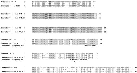 Seven class IIa bacteriocins were predicted: carnobacteriocin BM1 and BM1.2, carnobacteriocin B2 and B2.2, piscicolin 126 and 126.2, and carnobacteriocin B9.4 (Figure 5). Class IIa bacteriocins are heat stable, non-modified, cationic, hydrophilic, and hydrophobic peptides that are exported thanks to a double–glycine-containing leader peptide. They classically have a molecular weight of less than 10 kDa [59,60]. The pediocin-like bacteriocins are particularly active against Listeria spp. The N-terminal region contains two or four cysteine residues joined by one or two disulfide bridges, and a conserved YGNGV-C motif (less frequently the valine is replaced by leucine) while the C-terminus is less conserved [57].