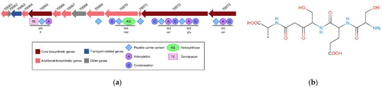 An NRPS-PKS BGC of 26.3 kbp comprising 13 CDSs was predicted in the genome of C. maltaromaticum 10040100629 (Figure 8, Table 2). Altogether, the CDSs encode seven peptide carrier protein domains, four adenylation domains, five condensation domains, one ketosynthase domain, and one termination domain (Figure 8a). Five modules (Figure 8a) were predicted to synthesize a metabolite with the following structure: (ser) + (glu − ser) + (mal) + (X) (Figure 8b). Additional CDSs whose function is compatible with the synthesis of specialized metabolites are also present and encode one 4’-phosphopantetheinyl transferase, two thioesterases, two Acyl-CoA dehydrogenases, and one aminopeptidase (Table 2).